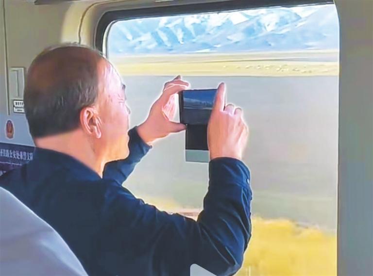 視頻中,一男子舉著手機,透過車窗面對著藍天、雪山、草原情不自禁地抒情:祁連山下,各族兒女兩千多年來在華夏的文明史上書寫了鞏固民族大業(yè)、實現祖國統(tǒng)一、民族繁榮的恢弘歷史。朋友們,來張掖!感受兩千年的絲綢之路,感悟現代的動車奔跑在祖國的大地上,讓中華在實現偉大復興的磅礴征程中恢弘勃發(fā)的新長征、新歷史。