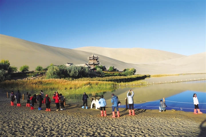 敦煌市鳴沙山·月牙泉景區(qū)被秋色浸染,花草樹木、藍天樓閣、泉水沙漠與駝隊構(gòu)成了一幅迷人畫卷,吸引眾多游客前來領略大漠風光,體驗絲路風情。