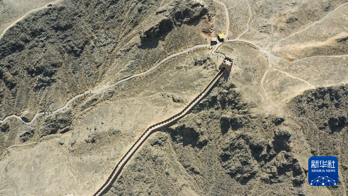 這是5月17日在甘肅省嘉峪關(guān)市拍攝的懸壁長(zhǎng)城(無人機(jī)照片)。新華社記者 陳斌 攝