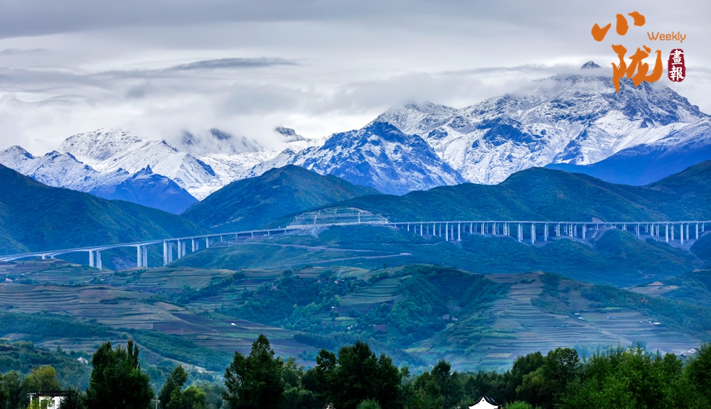 層巒疊嶂的雪峰和蔥郁的山坡、綠樹形成鮮明對(duì)比,成為一道靚麗的風(fēng)景線。駐足遠(yuǎn)觀,滿眼都是大自然的溫柔與浪漫。