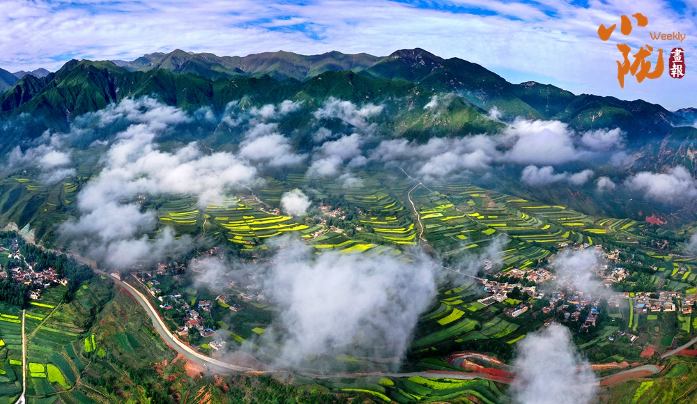在旅游大通道積石山段遠(yuǎn)眺,云霧穿山飄過,遠(yuǎn)處的村莊和梯田時(shí)隱時(shí)現(xiàn),遠(yuǎn)山近嶺,草樹煙村......置身其中,仿佛步入了人間仙境。