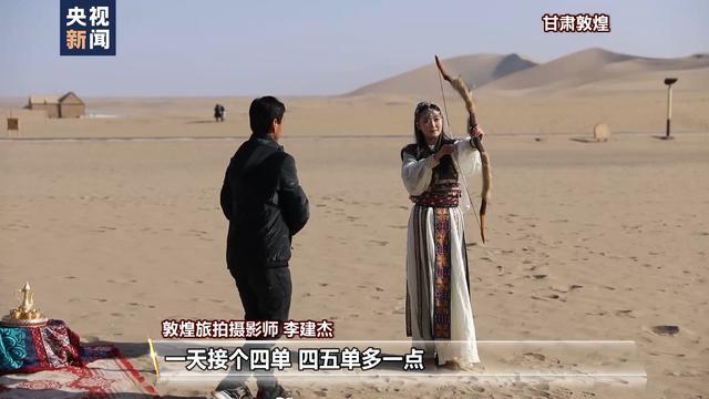 敦煌旅拍攝影師 李建杰:游客量變化還是挺大的,往年沒有這么多人。我作為一個(gè)攝影師,一天接四單,四五單多一點(diǎn)。