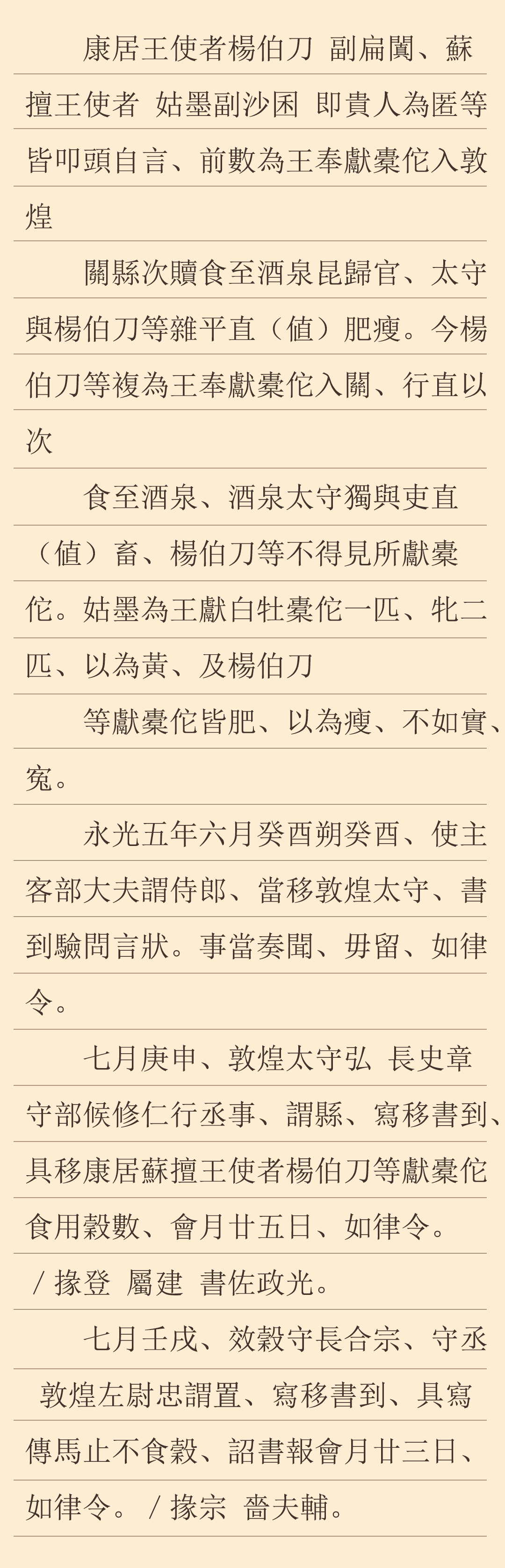永光五年六月初一日(公元前39年7月21日),朝廷主管對(duì)外交往和蠻夷事務(wù)的使主客諫大夫行文敦煌,要求敦煌太守接到文件后對(duì)此進(jìn)行查詢并按時(shí)上報(bào)中央,不得留遲。七月庚申(9月6日),敦煌大守弘、長(zhǎng)史章以及兼行丞事的守部候修仁聯(lián)署文件,下發(fā)效谷縣,要求縣廷接到文件后,將康居王使者路過(guò)縣境時(shí)為之提供的谷物數(shù)量,在七天之內(nèi)上報(bào)太守府。文書(shū)中有發(fā)文時(shí)掾、屬、書(shū)佐的具名。