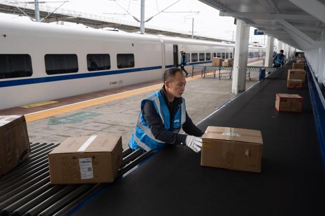 11月11日,在成都雙流西站,工人將電商快件從動車上搬運(yùn)下來。新華社記者 江宏景 攝