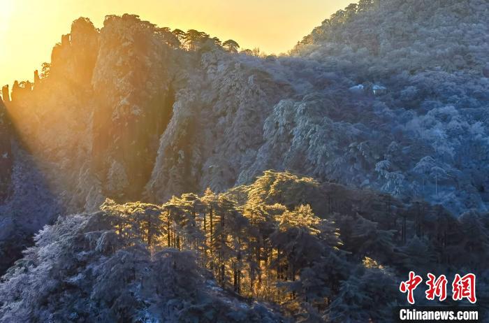 11月26日,黃山風(fēng)景區(qū)雪后初霽,朝陽照射在山峰上。張寧 攝