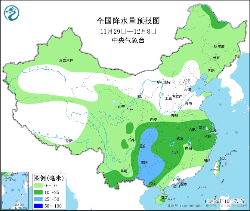 未來10天(11月29日-12月8日),東北地區(qū)中北部、內(nèi)蒙古東北部等地部分地區(qū)累計降水量有8~15毫米;西南地區(qū)東部和南部、江漢、江淮、江南西部和北部、廣西西部及臺灣島等地部分地區(qū)有10~20毫米,局地30~60毫米;云貴高原、內(nèi)蒙古東北部、東北地區(qū)等地部分地區(qū)累計降水量較常年同期偏多1~3倍,我國其余大部地區(qū)降水偏少。