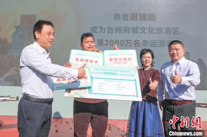 當(dāng)日9時(shí)33分,臺(tái)州府城景區(qū)智慧旅游系統(tǒng)自動(dòng)鎖定第2000萬(wàn)名游客所在的一支來(lái)自福建的旅行團(tuán),經(jīng)過(guò)數(shù)據(jù)確認(rèn)和復(fù)核,確定旅行團(tuán)成員謝錦綢為第2000萬(wàn)名游客。臨海為其準(zhǔn)備了包含大宋風(fēng)華定制游、府城十味大禮盒、新榮記旗下品牌餐廳尊享券、臺(tái)州府城IP形象文創(chuàng)禮盒等禮品的“好事來(lái)臨”府城大禮包。