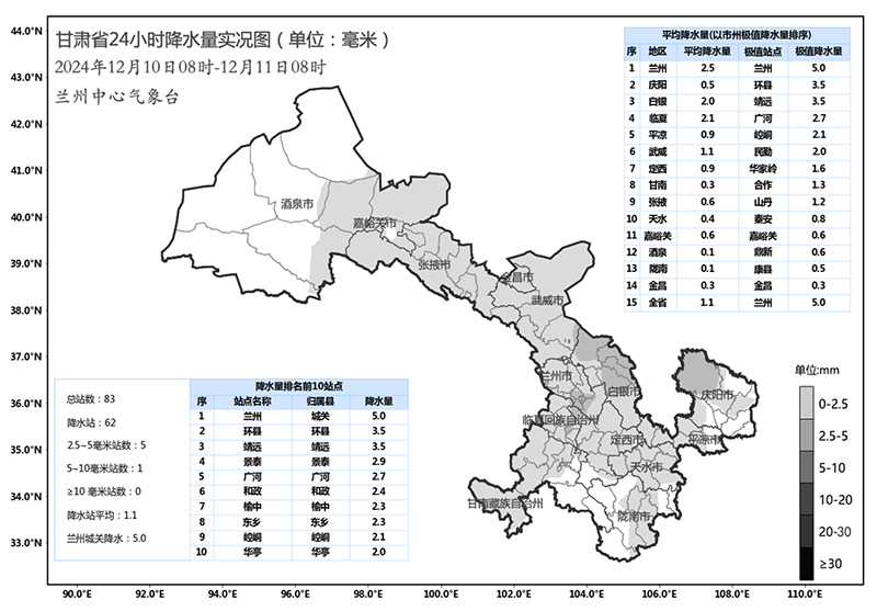 中國(guó)甘肅網(wǎng)12月11日訊(西北角·中國(guó)甘肅網(wǎng)記者 沈文剛)12月10日8時(shí)至12月11日8時(shí),全省共計(jì)62個(gè)縣區(qū)出現(xiàn)小雪,其中蘭州主城區(qū)出現(xiàn)大雪,慶陽(yáng)北部、白銀中部和北部、臨夏西南部出現(xiàn)中雪。較大降水量出現(xiàn)在蘭州本站5.0mm、靖遠(yuǎn)3.5mm、環(huán)縣3.5mm、景泰2.9mm、廣河2.7mm。