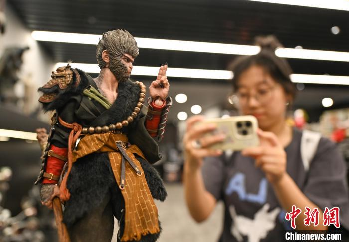 8月23日,《黑神話:悟空》人偶手辦生產(chǎn)企業(yè)內(nèi),展出的“天命人”吸引參觀者。王剛 攝