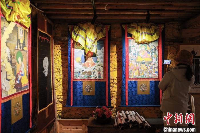 12月22日,在勒通古鎮(zhèn)的“唐卡館”,一位畫師繪制唐卡吸引游客駐足觀看。中新社記者 薛蒂 攝
