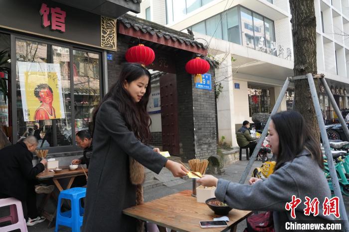 12月31日,四川成都,面館店主(左)為影迷發(fā)放自制的紀(jì)念卡片。中新社記者 安源 攝