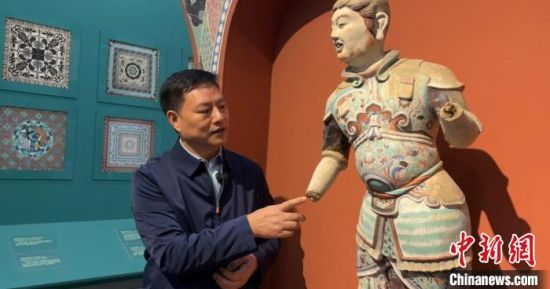 2023年2月,甘肅省蘭州市,汪萬福在敦煌藝術(shù)館向中新社記者介紹莫高窟第194窟南方增長天王塑像復(fù)制過程。 王牧雨 攝
