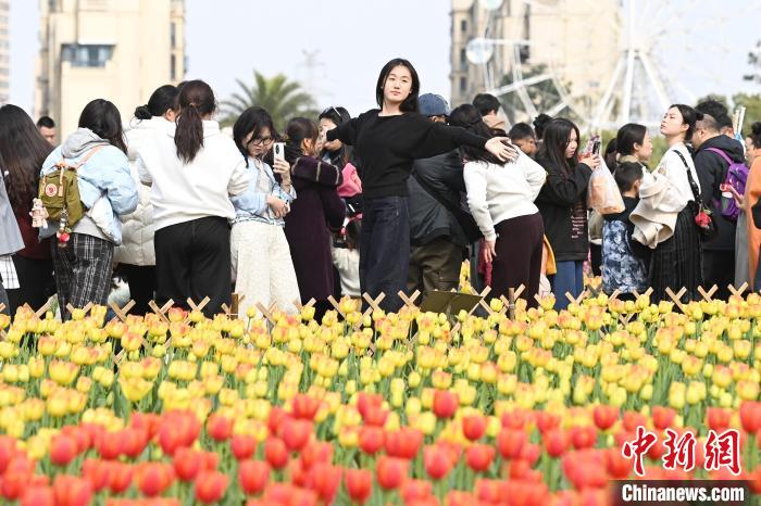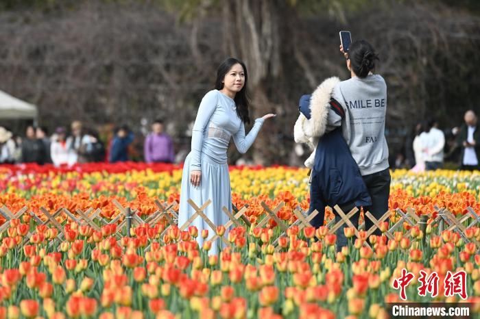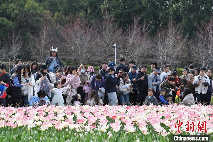 3月16日,位于湖南長沙的湖南省植物園數十萬株郁金香肆意綻放,五彩斑斕的花瓣交織成一片絢麗花海,引得眾多游人紛至沓來,享受愜意春日。圖為游人置身花叢中。中新社記者 楊華峰 攝