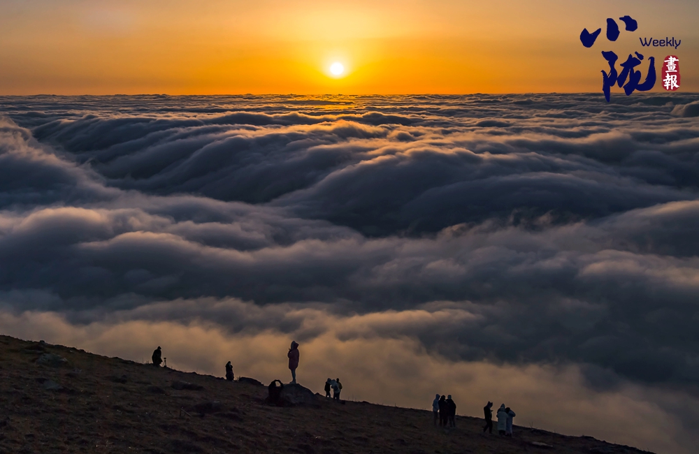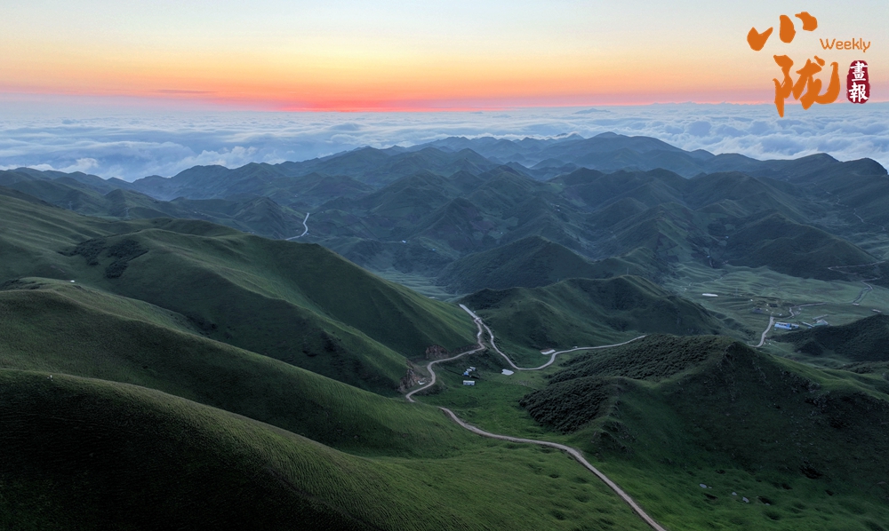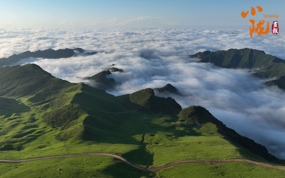 登頂望遠(yuǎn),千壩草原高山、草甸、草原相互交織,牛馬、羊群像一顆顆散落的珍珠點(diǎn)綴其中。茫茫云海鋪滿(mǎn)整個(gè)天際,翻涌的流云大河奔騰,蔚為壯觀,如臨于大海之濱。