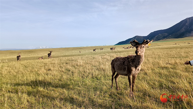 初夏的肅南大河草原牧草逐漸返青,一群群馬鹿在草原上悠閑覓食,游客到來并沒有打擾它們的正?;顒?dòng)。