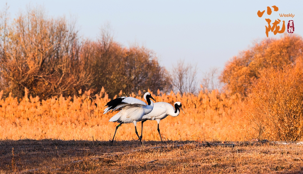 丹頂鶴時(shí)而凌空飛舞,時(shí)而散步、覓食,穿梭在金黃的蘆葦間。