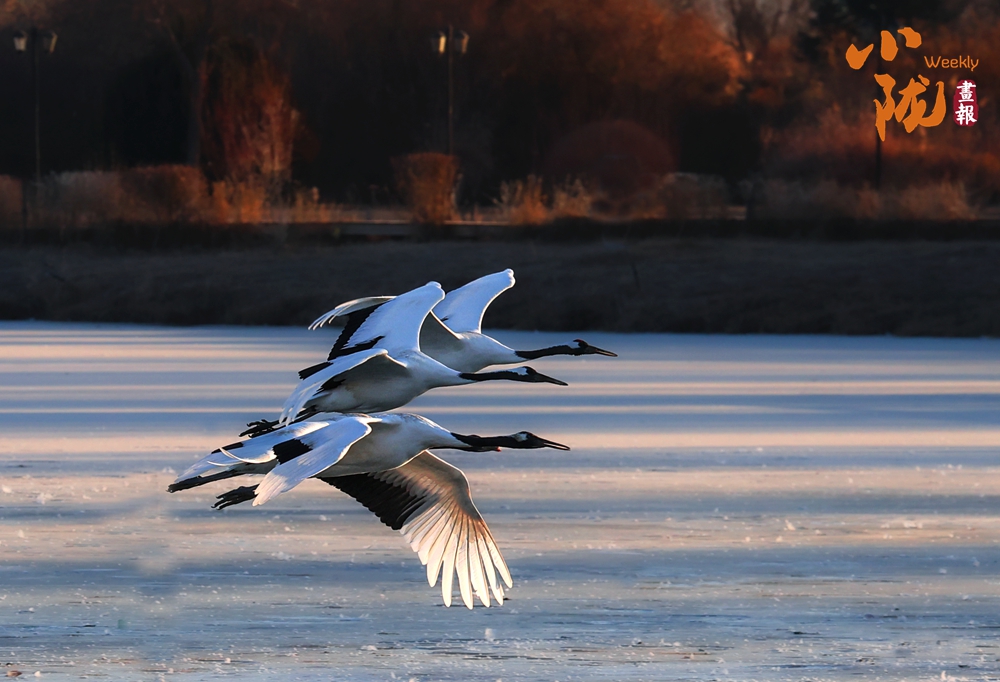 陽光灑在冰面上,晶瑩閃亮。十多只丹頂鶴翩翩起舞,飄逸的飛翔,優(yōu)雅的舞姿,輕盈的腳步,用最純粹的姿態(tài)演繹著生命的禮贊。