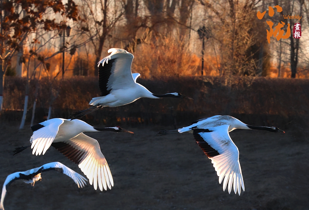 金色的蘆葦坡上均能看到它們優(yōu)雅的身影。這里,除了丹頂鶴,還有天鵝、綠頭鴨、斑頭雁等很多水鳥,它們的倩影成為濕地冬日里最動(dòng)人的靈動(dòng)色彩。