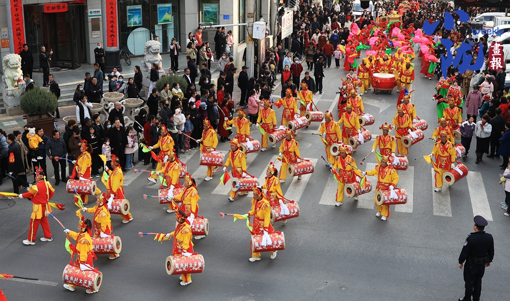太平鼓隊(duì)的指揮者豹頭環(huán)眼,胸前“帥”字披紅,手中兩米長(zhǎng)的令旗迎風(fēng)一展——百十面太平鼓瞬間炸響如雷。只見他騰挪跳躍,旗尖所指,鼓點(diǎn)隨之起伏,時(shí)而如萬馬奔騰,時(shí)而似春雨潤物。
